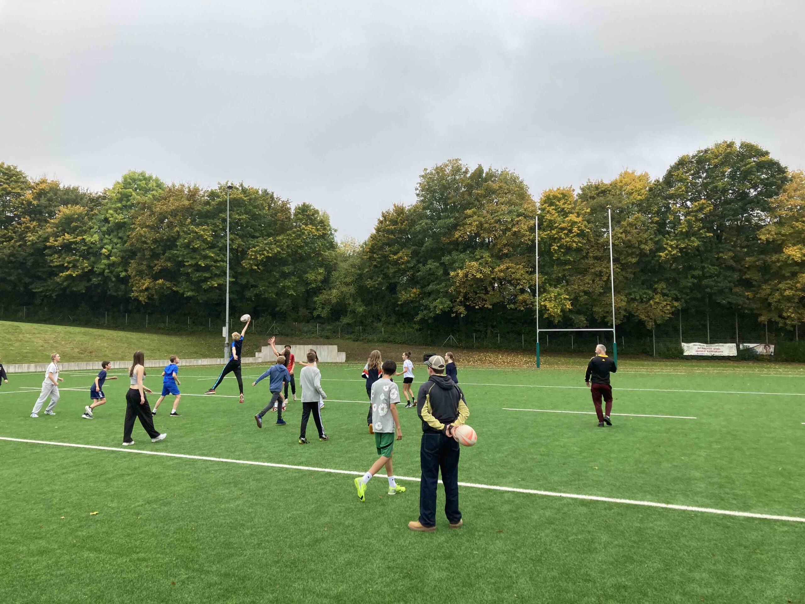 Die Schüler*innen waren begeistert vom intensiven, aber kontaktlosen Touch-Rugby. Nach den Herbstferien folgen noch zwei weitere Einheiten. Der Trainer spricht ausschließlich Englisch – so mussten die Schülerinnen und Schüler im Sportunterricht Anweisungen verstehen und umsetzen, ohne dass übersetzt wurde. Rugby wurde damit zu einem echten Beispiel für fächerverbindenden Unterricht zwischen Sport und Englisch.