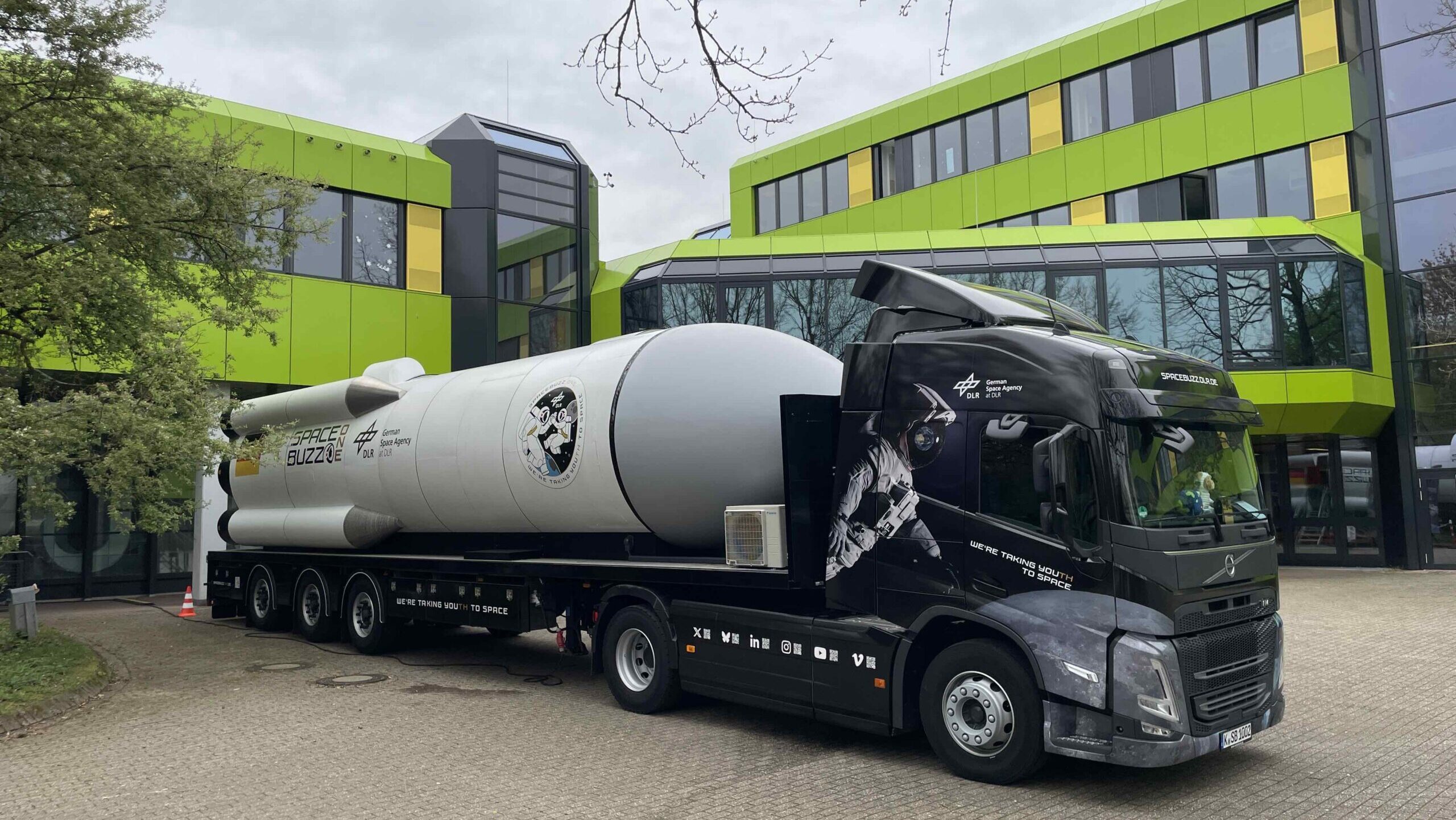 Am 13. April stand einen Tag lang eine Rakete auf dem Schulhof des AFG. Der SPACEBUZZ ONE der Deutschen Raumfahrtagentur im DLR ist ein begehbarer High-Tech-LKW, der äußerlich einer liegenden Rakete ähnelt und im Inneren neigbare und vibrierende Sitzplätze beherbergt. Die Schülerinnen und Schüler der Klassen 6 und 7 nahmen im Inneren Platz, setzten eine VR-Brille auf und starteten zu einem virtuellen Raumflug auf, bei dem sie die Erde umkreisten und – passend zur Mondmission der Artemis 2 – einmal um den Mond flogen. Von den Astronauten Alexander Gerst und Matthias Mauerer lernten sie dabei viel über unseren Heimatplaneten, seine Probleme mit dem menschengemachten Klimawandel, die Rückseite des Mondes und das Leben auf der ISS, bevor sie wieder auf der Erde landeten. Das Programm dient als Bereicherung des Physikunterrichts, in dem es vor- und nachbereitet wurde.