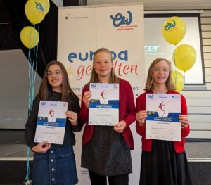 Ebenfalls nahmen Schülerinnen der Europa-AG erfolgreich am 71. Europäischen Wettbewerb mit dem Motto „Europa (un)limited“ teil. An der Altersklasse der Klasen 5 bis 7 entwickelten Lana Eschweiler und Lara Rentmeister ein Spiel, bei dem man anhand von Bildausschnitten berühmte Gemälde erraten muss. Damit belegten sie den 1. Platz auf Landesebene. Judith Völker holte in der Kategorie „fabelhaft“ mit ihrem Europatier Susi den dritten Platz. Wir gratulieren den Teilnehmerinnen und freuen uns sehr!