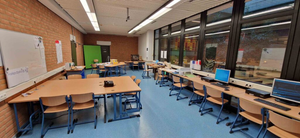Im Raum A 134, direkt neben der Schulbibliothek befindet sich der Makerspace unserer Schule. Es handelt sich um einen Raum, in dem Du kreative Ideen zum Leben erwecken kannst. Er wurde seit 2024 Stückweise durch Schülerinnen und Schüler der Making AG aufgebaut und eingerichtet. Hier kannst du deine Ideen in die Tat umsetzen und spannende Projekte realisieren. Ob du dich für 3D-Druck, Robotics, Fotografie mit Greenscreen, die Nutzung einer Cutting Maschine oder andere kreative Techniken interessierst – bei uns stehen dir alle Möglichkeiten offen!